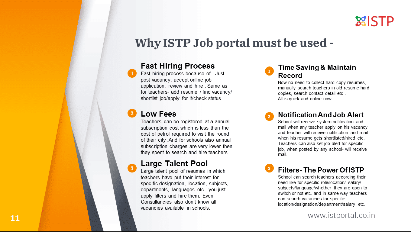 The Inter School Teachers Portal (ISTP) is a comprehensive online platform aimed at enhancing collaboration and support among schools, teachers, independent educators, and government bodies. The ISTP provides a range of services designed to improve educational standards, foster professional development, and facilitate job search for teachers and teachers search for schools vis its job portal, resource sharing within the educational community, School directory, CBSE/State board help desk, award & scholarships, ISTP certifications etc. Here’s an overview of the key features and benefits of the ISTP.​